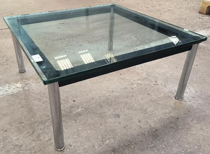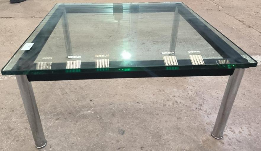 Table basse dans le goût du modèle LC10 design Le Corbusier, plateau en verre, structure en métal émaillé et chromé. Dim : 33 x 70 x 70 cm. Localisation : 34 avenue du Général Patton 02880 Crouy