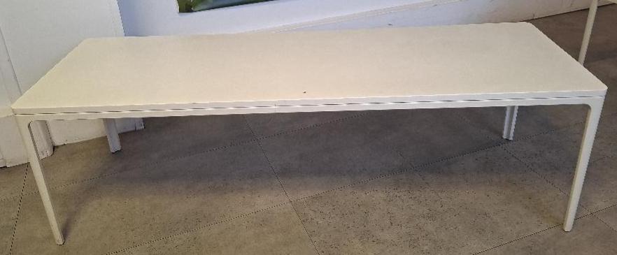 Table basse design Jasper Morrison modèle Plate Table édition Vitra, plateau rectangulaire à bords arrondis en bois stratifié blanc sur piétement en acier laqué blanc (petit éclat sur le plateau). 36 x 120 x 40 cm. Localisation: 26 rue Cambaceres – 75008 Paris. (2eme étage)