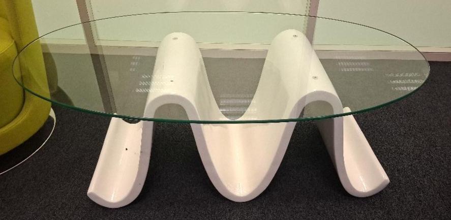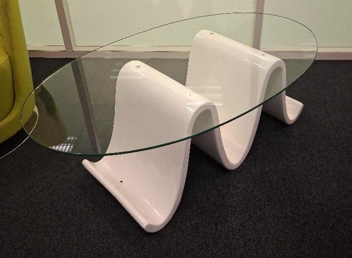 Table basse en forme de vague, support en bois laqué blanc, plateau ovale en verre transparent. 42 x 120 x 70 cm. 1 unité. Localisation: Entresol salle café codir