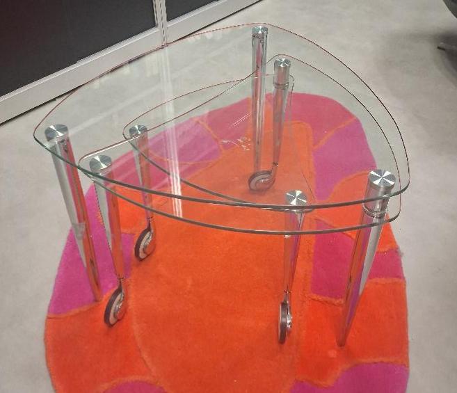 Table basse gigogne à 3 plateaux en verre dont 2 pivotants sur roulettes. 49 x 64 x 65 cm. Localisation: étage 0 Ludothèque