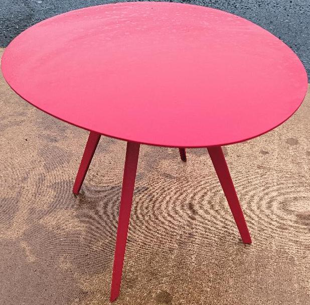 Table basse, plateau et piètement en métal de couleur rouge. Dim : 40 x 50 x 43 cm. Localisation : 30 rue Beauregard 60440 Nanteuil-le-Haudouin