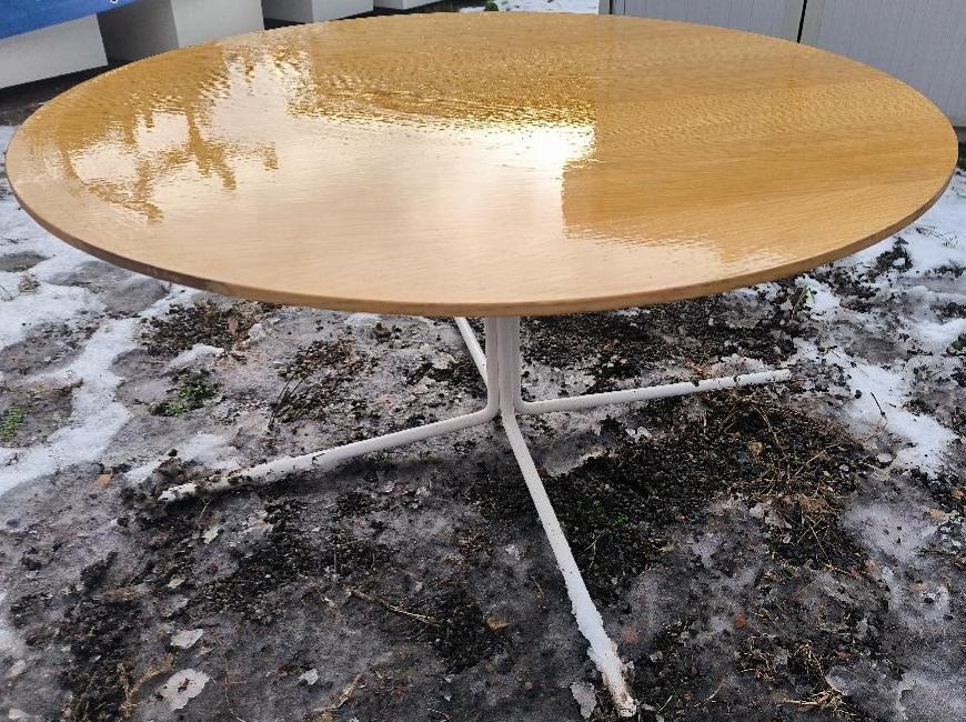 Table basse ronde, plateau en bois de couleur hêtre, piètement en métal blanc. Dim : 42 x 80 cm. Localisation : 30 rue Beauregard 60440 Nanteuil-le-Haudouin