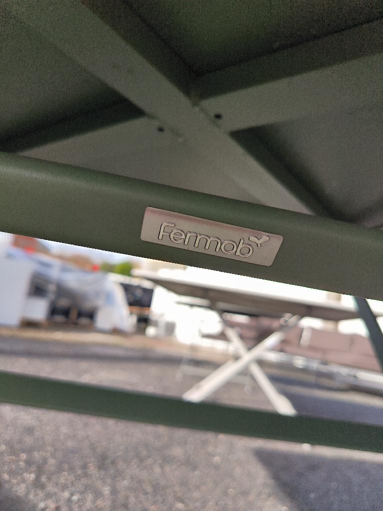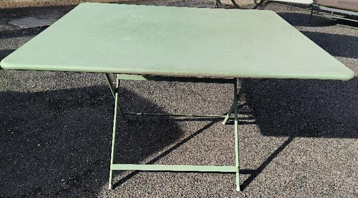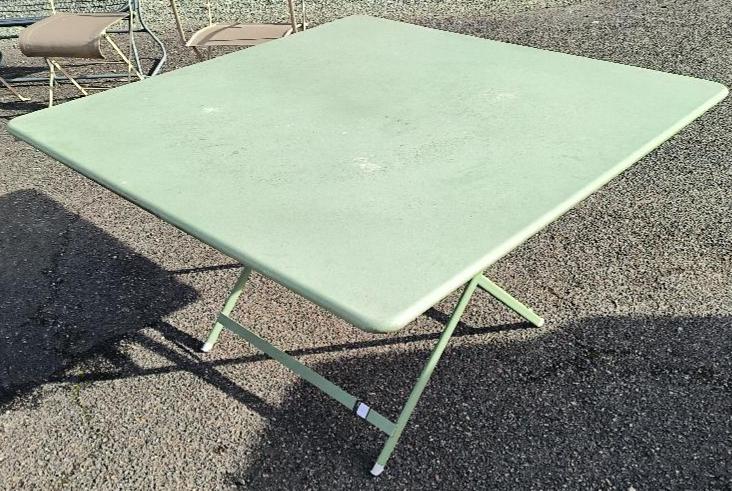 Table carrée d’extérieur en métal vert de marque Fermob. (usures) Dim. : 74 x 130 x 130 cm. Localisation : 30 rue Beauregard 60440 Nanteuil-le-Haudouin.