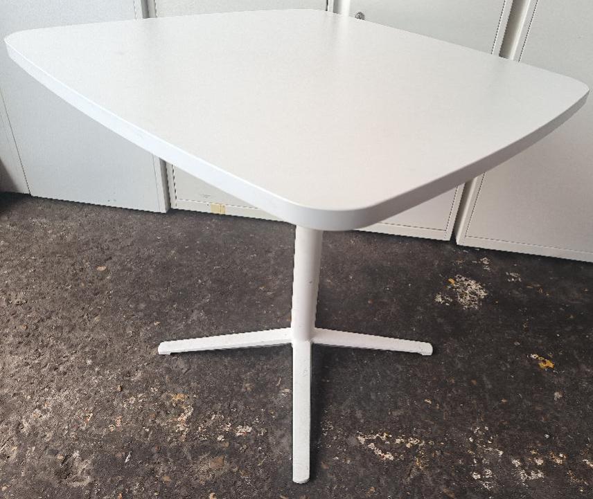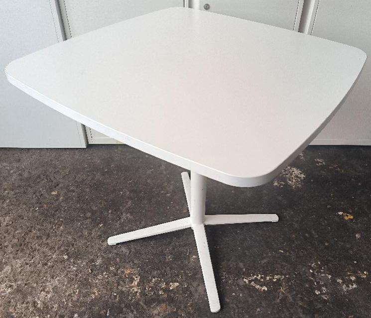 Table carrée plateau en bois stratifié blanc reposant sur un pied colonne en acier blanc en étoiles à 4 branches. Dim : 75 x 80 x 80 cm. 4 unités. Vendu à l’unité avec faculté de réunion. Localisation : 30 rue Beauregard – 60440 Nanteuil-le-Haudouin
