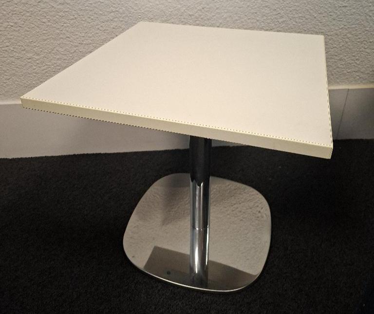 Table d’appoint plateau carré en bois stratifié blanc, piètement colonne en acier chromé.44 x 45 x 45 cm. 3 unités. Localisation: ES salle Lease&Co (3 unités)/ 5ème étage (2 unités)