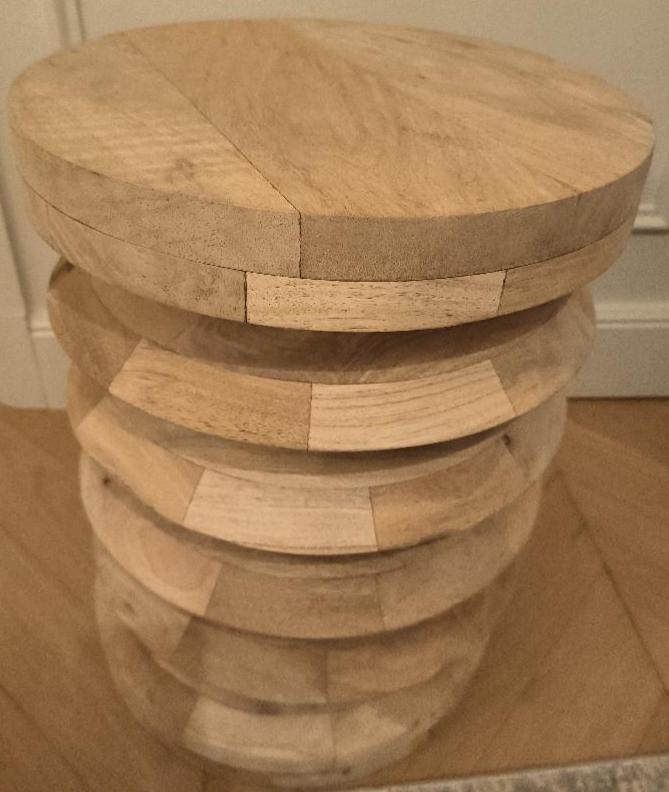 Table de chevet ronde en bois naturel. Dim : 45 x 34 cm. 16 unités. Vendu à l’unité avec faculté de réunion. Localisation: BLB, 3 rue de la Fossé aux Leux – 91700 Sainte Geneviève des Bois