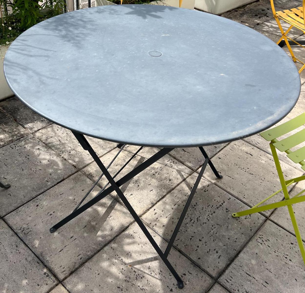 Table de jardin pliante en tôle grise, piètement noir. 74 x 96 x 74 cm. Localisation: 30 rue Beauregard 60440 Nanteuil-le-Haudouin.