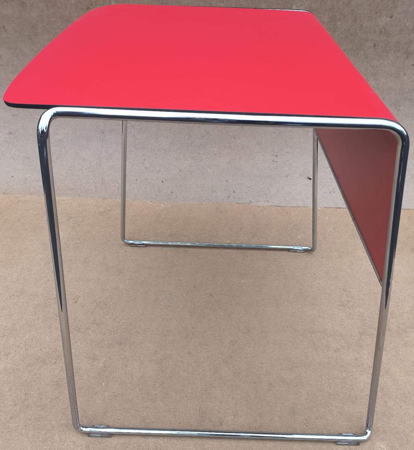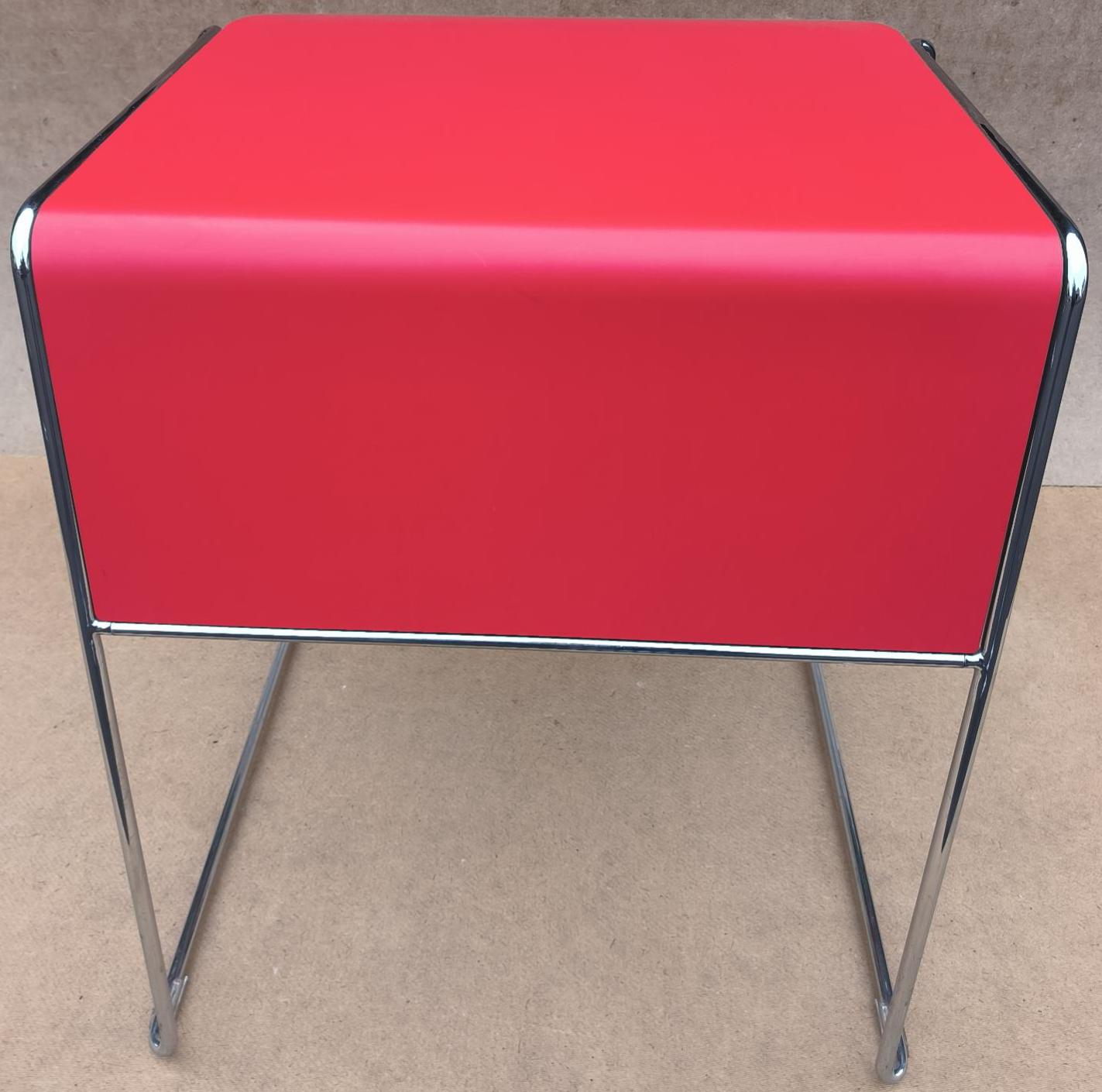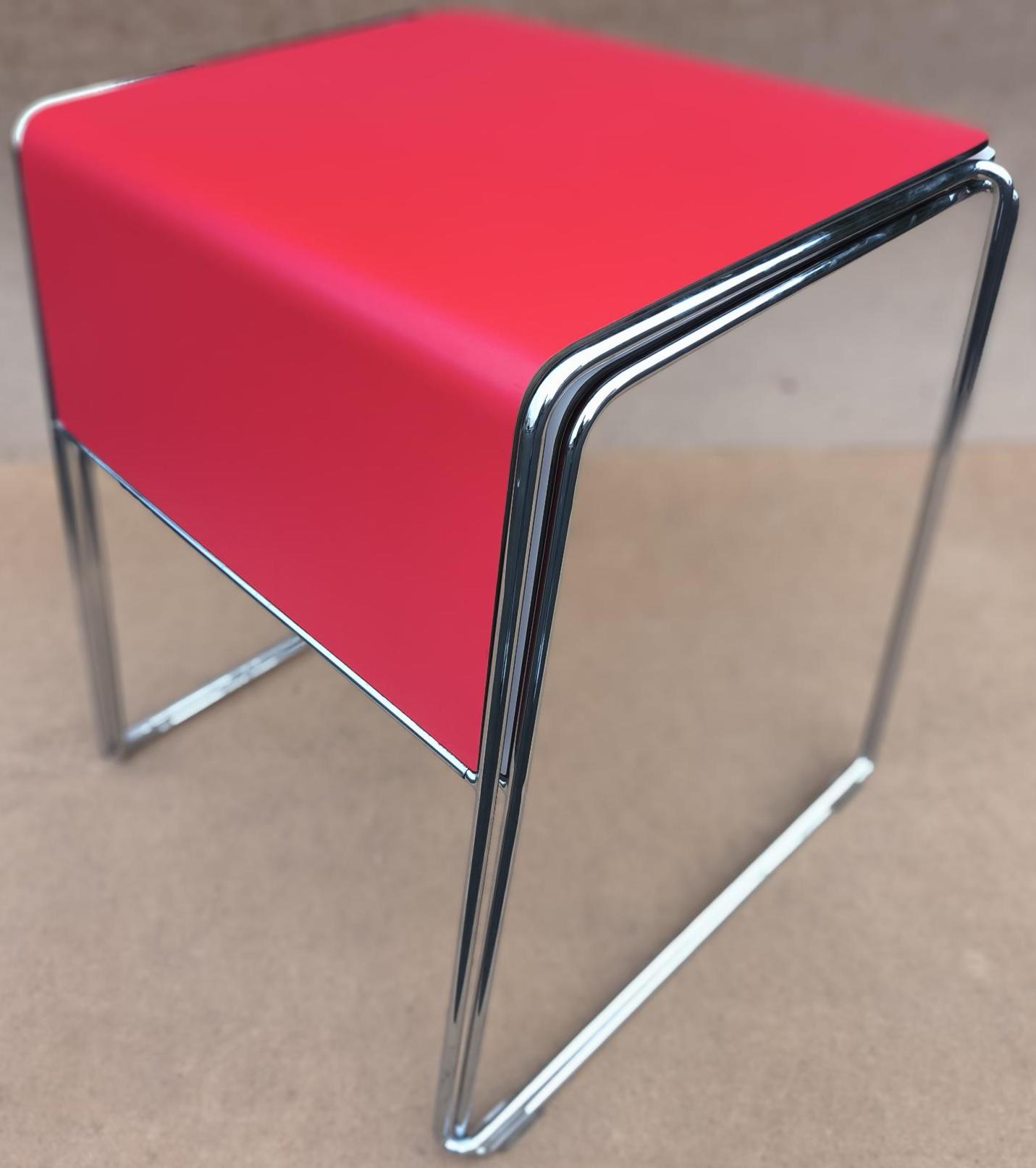 Table de marque Howe, empilable, plateau rouge, piétement chromé. 73 x 63 x 53 cm. 4 unités. Vendu à l’unité avec faculté de réunion. Localisation: 30 rue Beauregard 60440 Nanteuil-le-Haudouin.