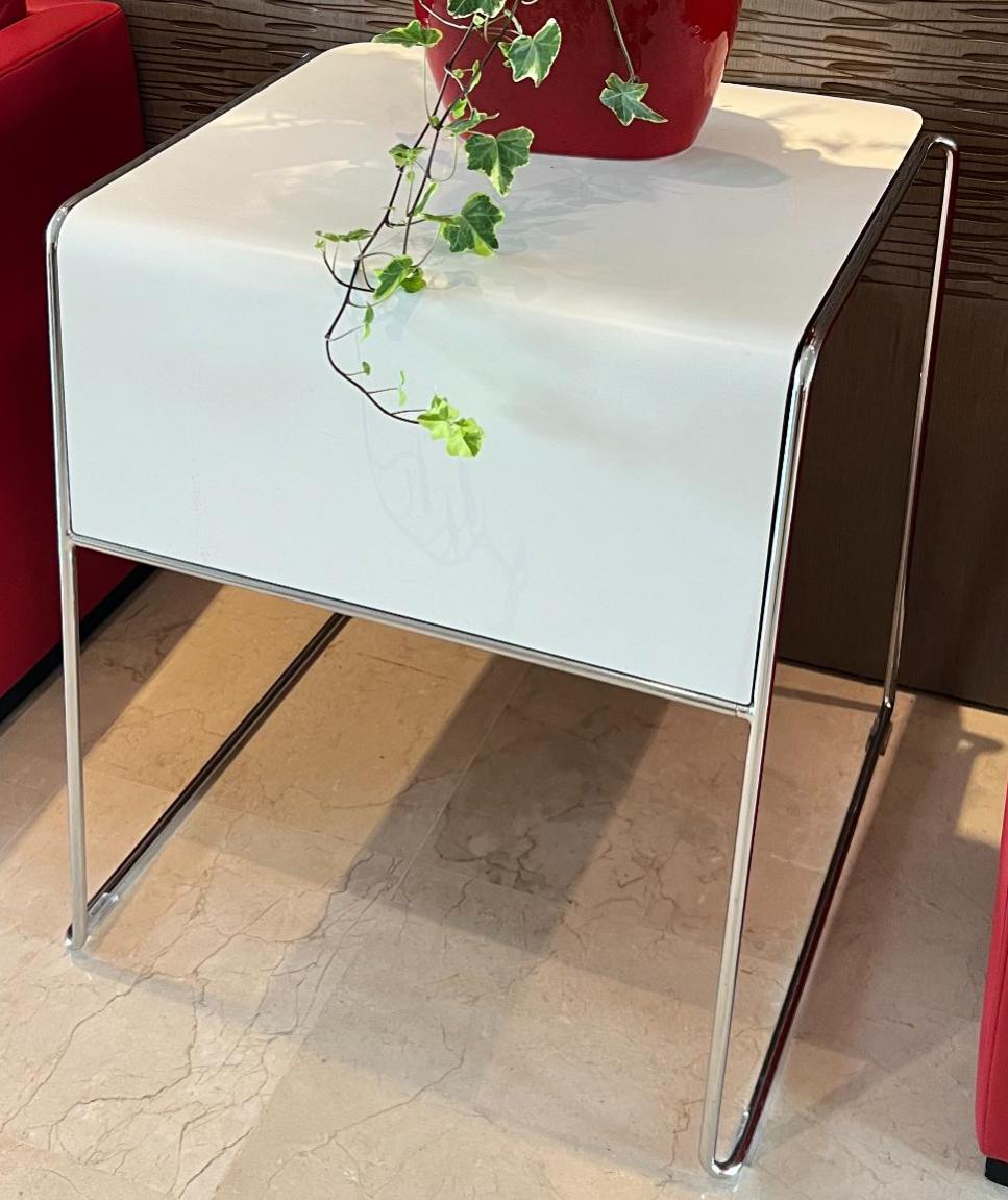 Table de marque Howe, plateau blanc, piétement chromé (dim : 71 x 63 x 57 cm). Localisation: 30 rue Beauregard 60440 Nanteuil-le-Haudouin.