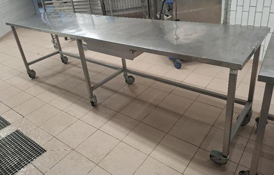 Table de préparation sur roulettes en inox avec 1 tiroir en ceinture. 90 x 300 x 70 cm. (usures, 1 roue à refixer). Localisation: cuisines – Image 2