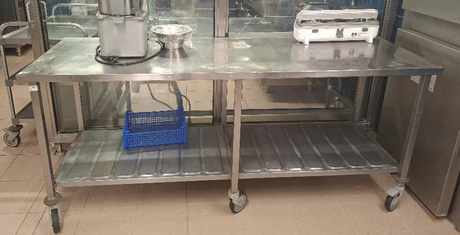Table de préparation sur roulettes en inox avec étagère en partie basse. 90 x 205 x 70 cm. Localisation: cuisines