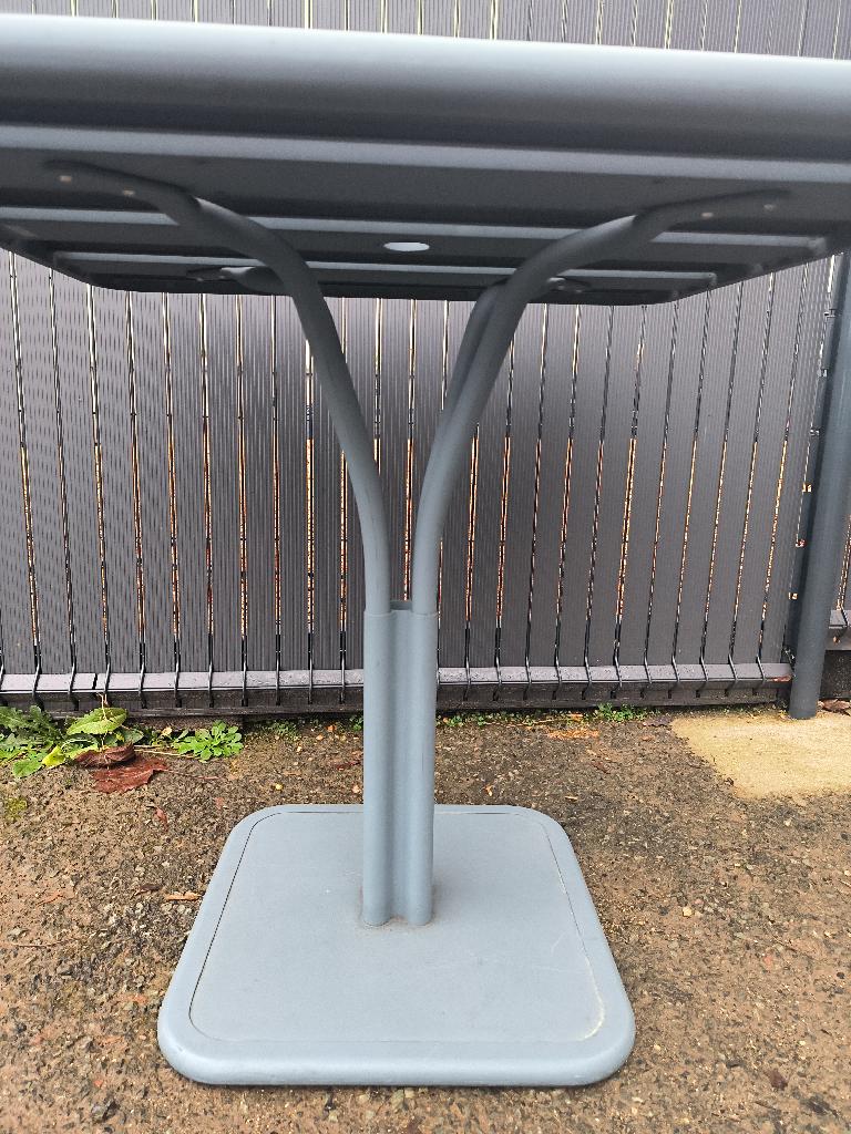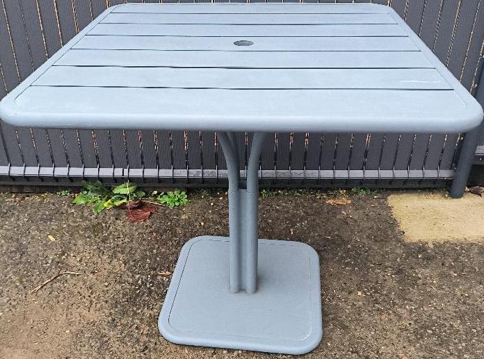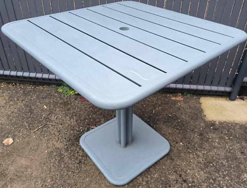 Table de repas 4 personnes extérieur design Frédéric Sofia modèle Guéridon Luxembourg édition Fermob, structure en aluminium de couleur gris, plateau avec trou pour parasol diamètre 37 mm. 74 x 80 x 80 cm. 3 unités (dont 1 unité abîmée). Localisation : 30 rue Beauregard 60440 Nanteuil-le-Haudouin