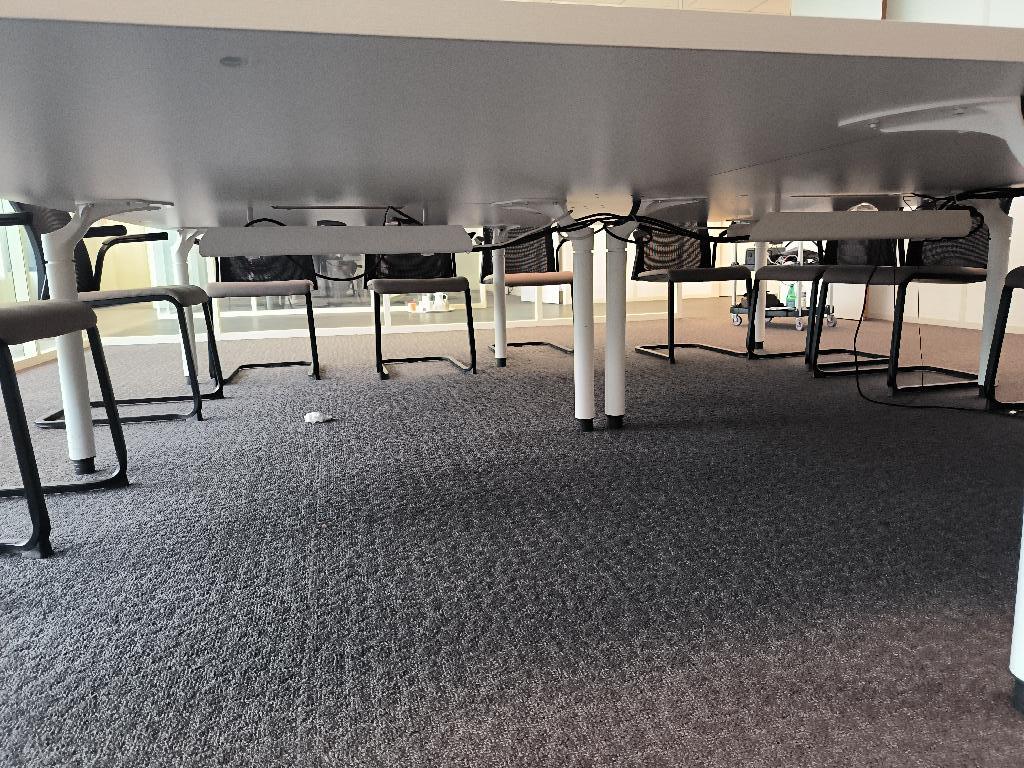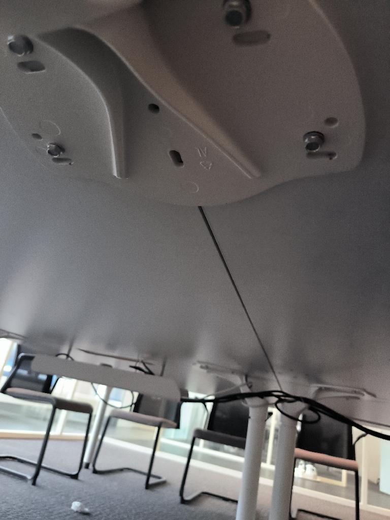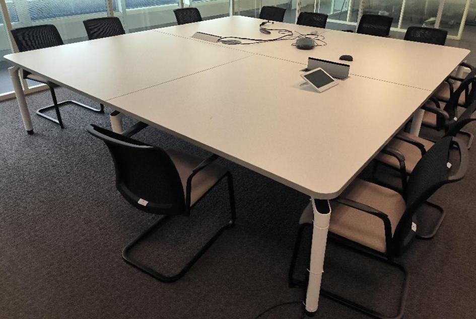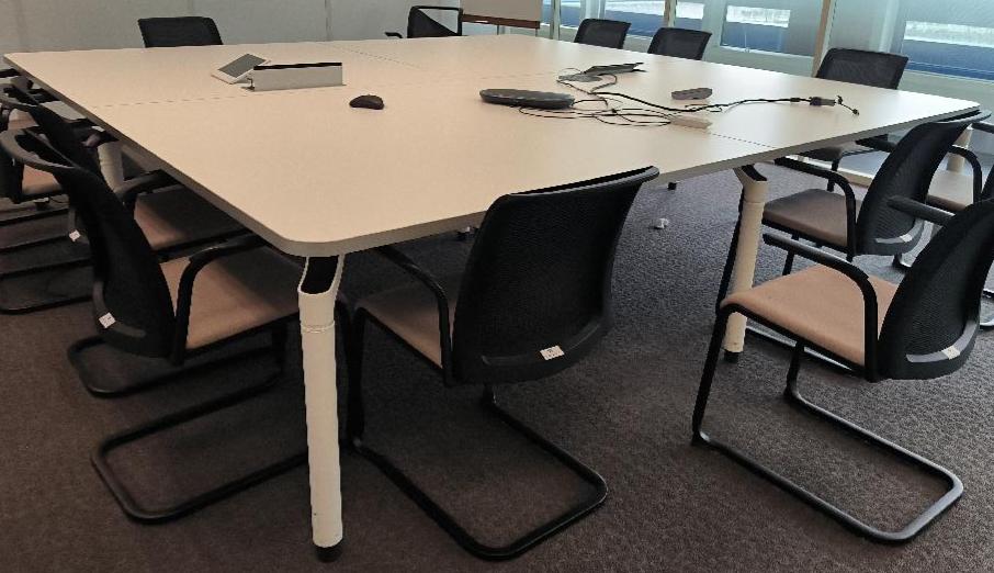 Table de réunion carrée de marque Majencia, plateau en bois de couleur blanc avec 2 trappes, piétement en métal de couleur blanc. Dim : 72 x 300 x 300 cm. 4 UNITÉS AU TOTAL. (étiquette 5033)
