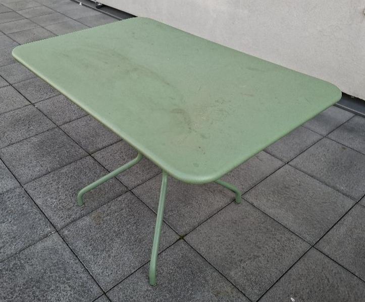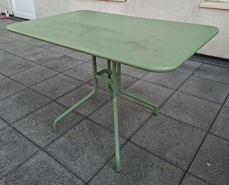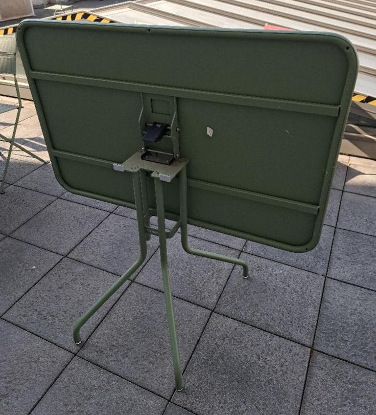 Table d’extérieur basculante design Philippe Mathieu modèle Pétale édition Fermob en tôle couleur vert cactus. 74 x 110 x 70 cm. 4 unités. Vendu à l’unité avec faculté de réunion. Localisation: 30 rue Beauregard – 60440 Nanteuil-Le-Haudouin