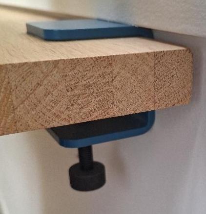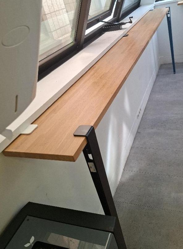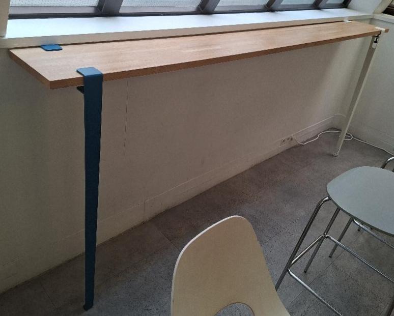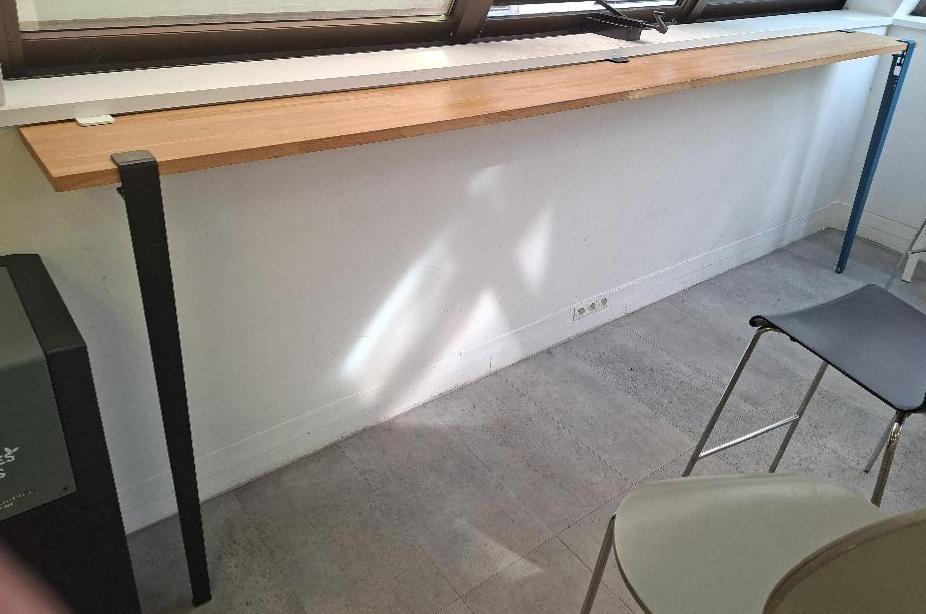 Table haute de marque Tiptoe, plateau rectangulaire en bois, piétement en acier laqué noir bleu ou blanc et étaux. 110 x 325 x 30 cm. 3 unités. Vendu à l’unité avec faculté de réunion. Localisation: 26 rue Cambaceres – 75008 Paris. (1er cafet)