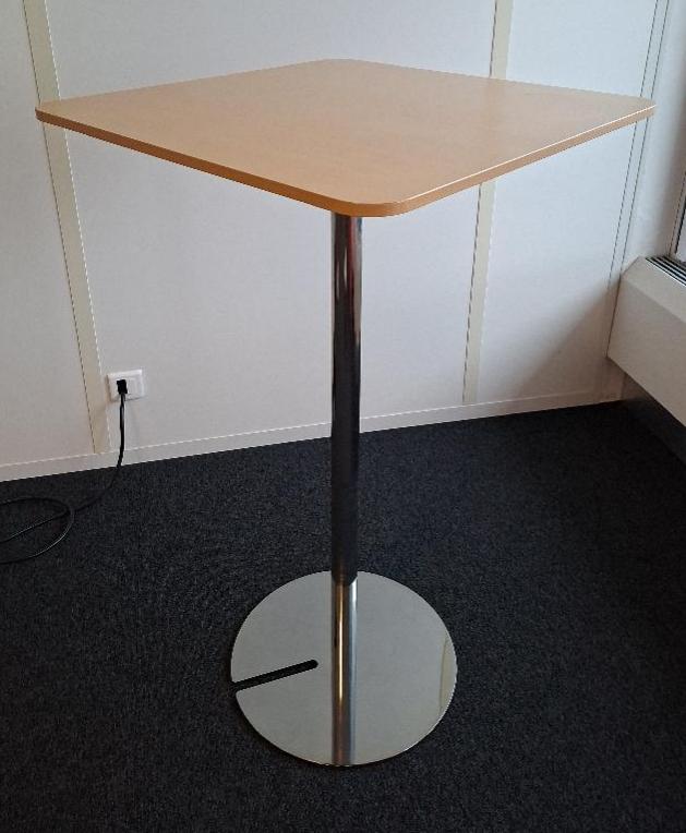 Table haute, plateau carré à bords arrondis en bois stratifie couleur hêtre, pied colonne en acier chromé sur pied colonne sur base circulaire. 111 x 65 cm. 4 unités. Localisation: 6ème étage salle 607