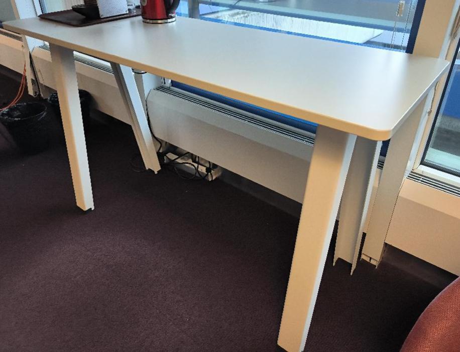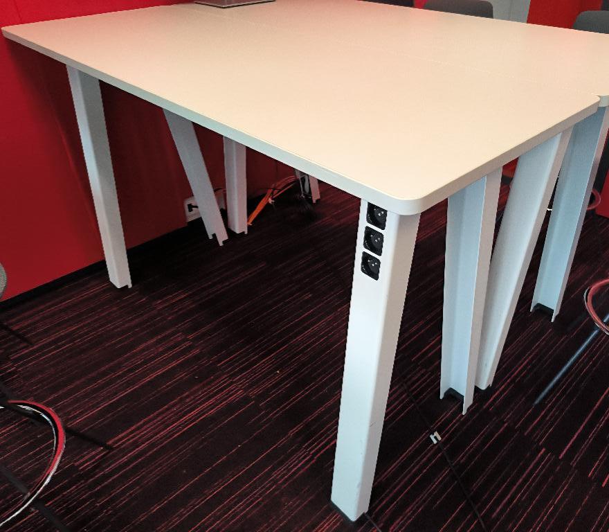 Table haute, plateau en bois de couleur blanc, piétement en métal de couleur blanc avec prises électriques. Dim : 100 x 170 x 60 cm. 23 UNITÉS AU TOTAL. (étiquette 5045) 5ème étage petit salon côté rouge : 1 unité 5ème étage bureaux face à l’espace détente : 2 unités 5ème étage open-space bleu : 1 unité 4ème étage open-space rouge : 2 unités 4ème étage open-space vert : 2 unités 3ème étage open-space vert : 2 unités 3ème étage open-space bleu : 1 unité 2ème étage open-space rouge : 2 unités 2ème étage open-space bleu : 4 unités 1er étage open-space vert : 2 unités 1er étage open-space rouge : 2 unités 1er étage cafétéria : 2 unités