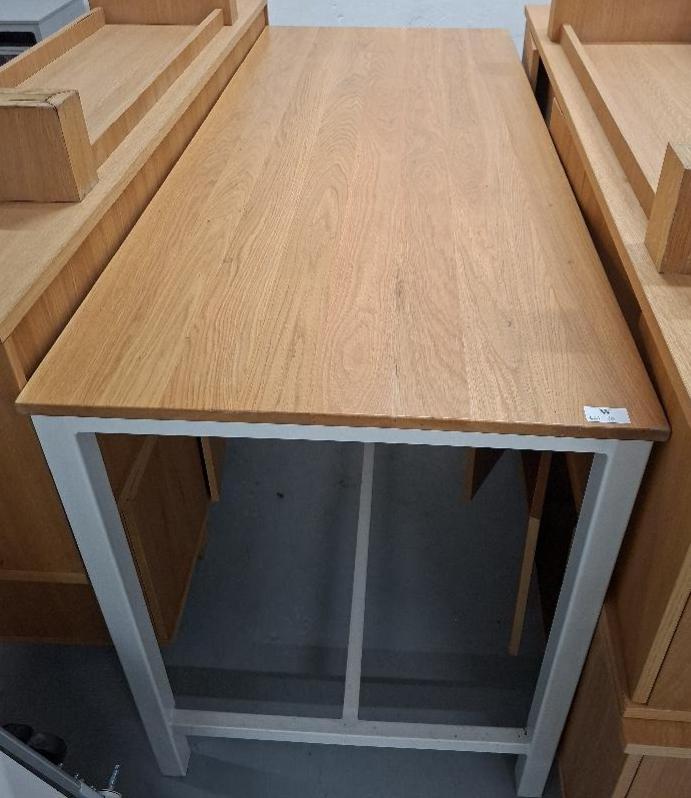 Table haute rectangulaire, plateau en bois couleur chêne, piétement en acier laqué blanc. 105 x 180 x 80 cm. Localisation: 5 rue des Italiens – 75009 Paris