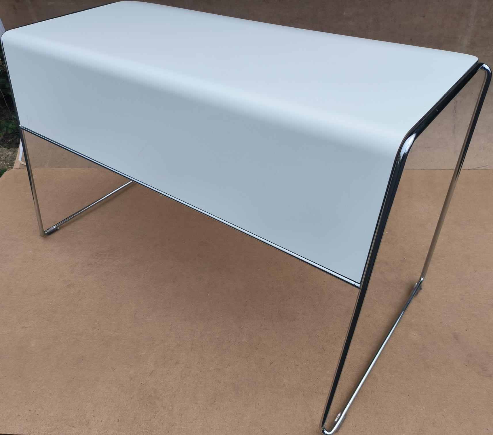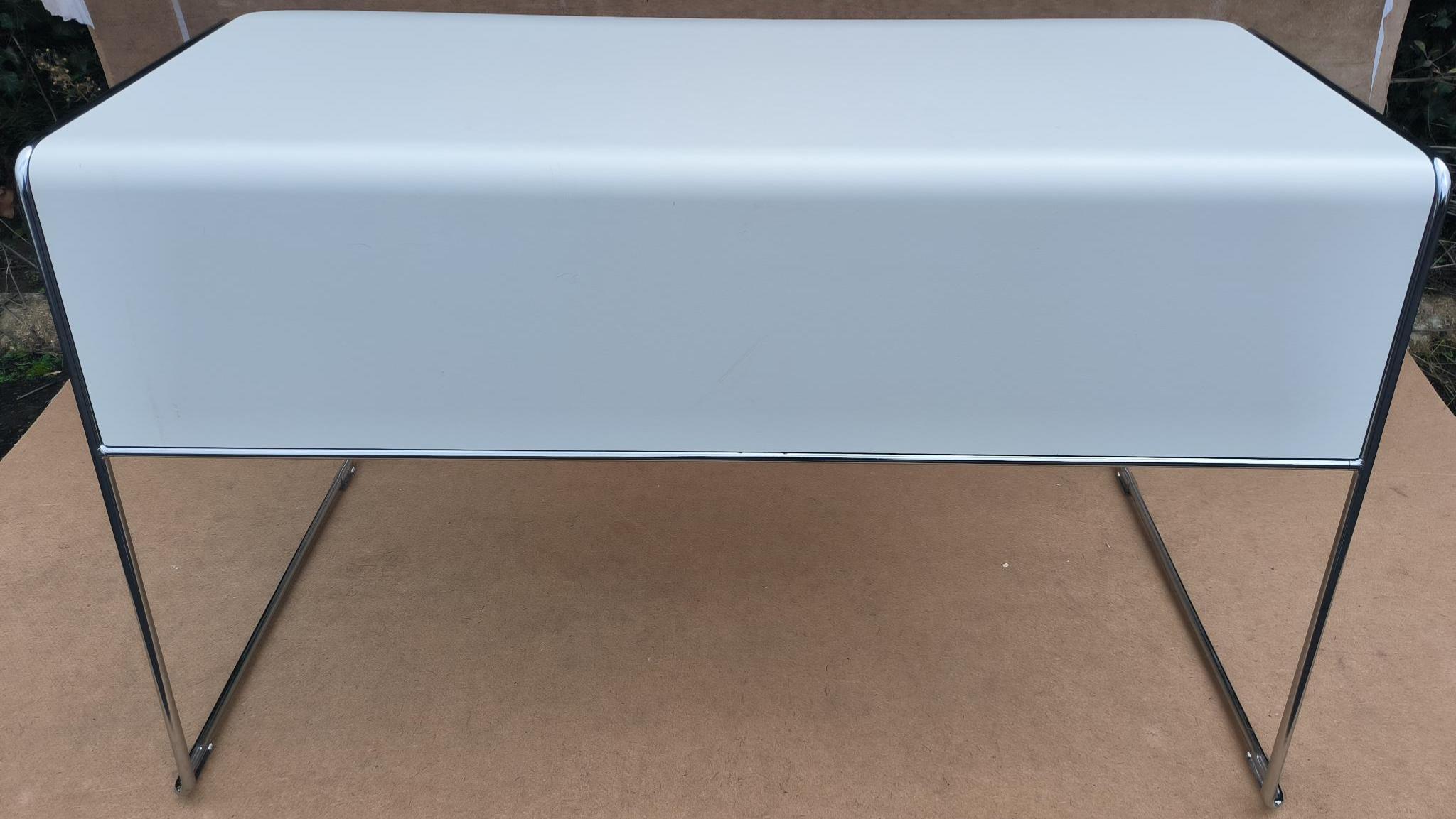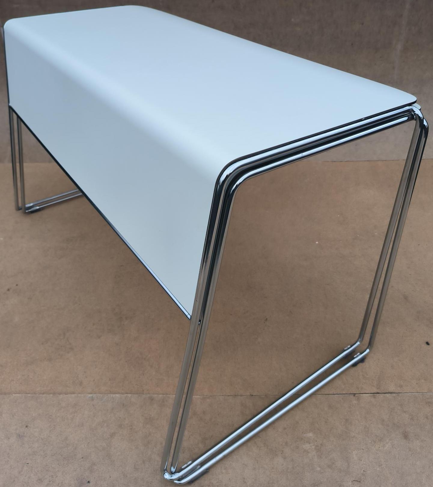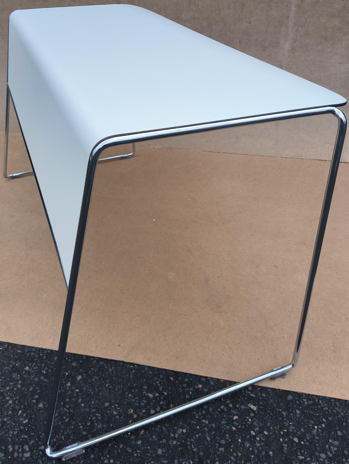 Table rectangulaire de marque Howe, plateau blanc, piétement chromé. 74 x 123 x 54 cm. 6 unités. Vendu à l’unité avec faculté de réunion. Localisation: 30 rue Beauregard 60440 Nanteuil-le-Haudouin.