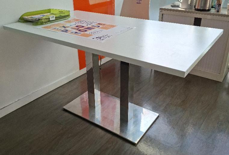 Table rectangulaire plateau en bois stratifié blanc, piétement chromé. 76 x 140 x 79 cm. 2 unités. Vendu à l’unité avec faculté de réunion. Localisation: 19 rue Neuve Tolbiac – 75013 Paris (7ème: 1 unité / 6ème: 1 unité)