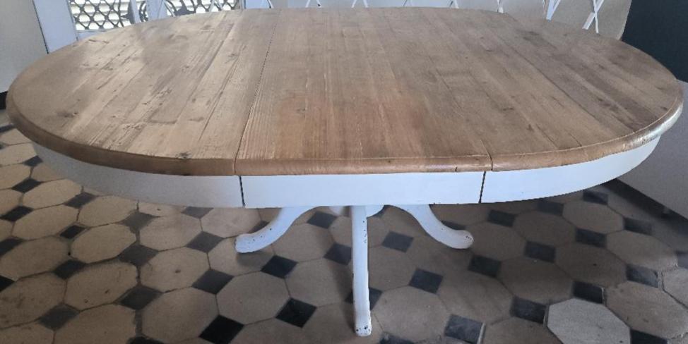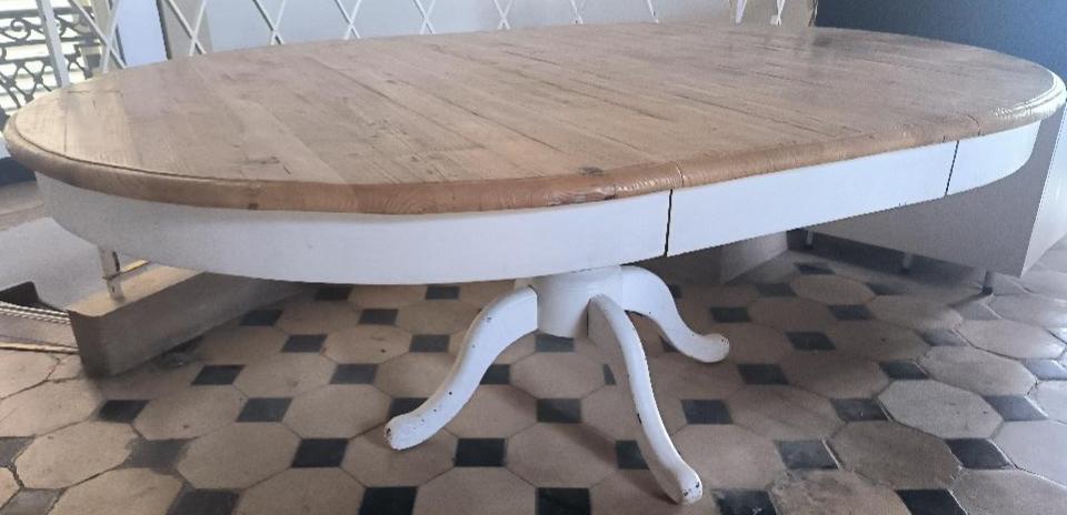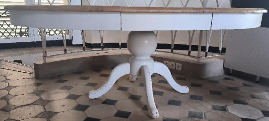 Table ronde avec une rallonge en bois naturel de marque Interiors, reposant sur un pied balustre sur base à 4 branches en bois laqué blanc. Dimension en configuration ovale: 75 x 164 x 115 cm. 2 unités. Vendu à l’unité avec faculté de réunion. Localisation: BLB, 3 rue de la Fossé aux Leux – 91700 Sainte Geneviève des Bois