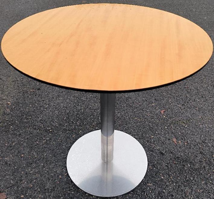 Table ronde de marque Sancal, plateau en bois de couleur hêtre, piétement en métal chromé. Dim : 75 x 70 cm. Localisation : 30 rue Beauregard 60440 Nanteuil-le-Haudouin