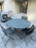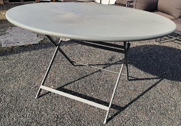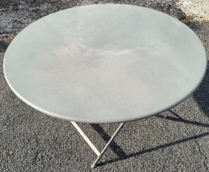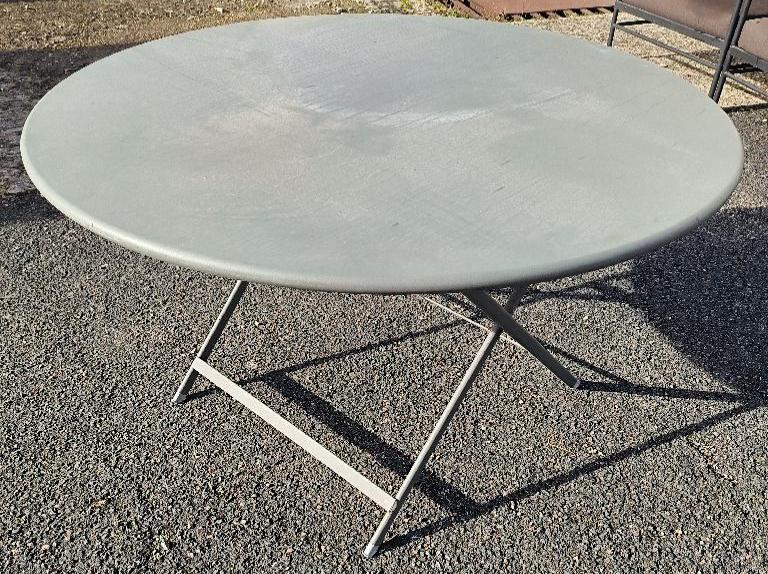 Table ronde d’extérieur en métal gris de marque Fermob. (usures) Dim. : 74 x 128 cm. Localisation : 30 rue Beauregard 60440 Nanteuil-le-Haudouin.