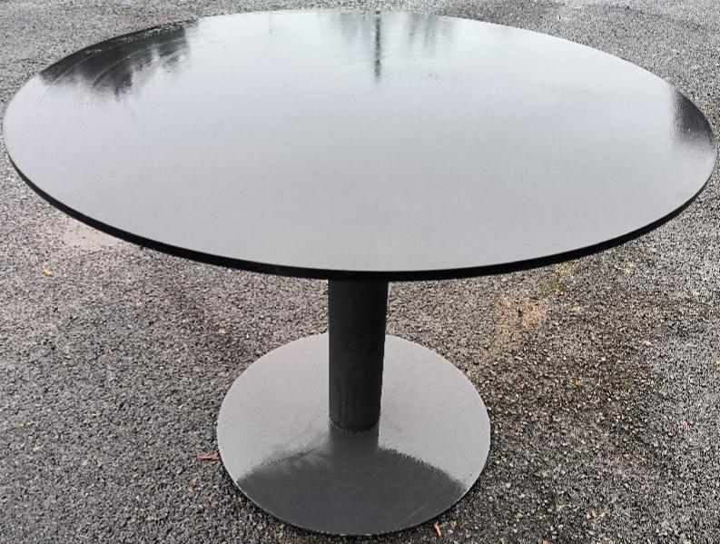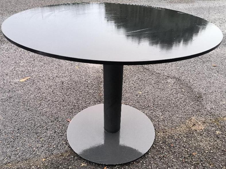 Table ronde, plateau en composite de couleur noir, piétement en métal anthracite. Dim : 73 x 100 cm. Localisation : 30 rue Beauregard 60440 Nanteuil-le-Haudouin