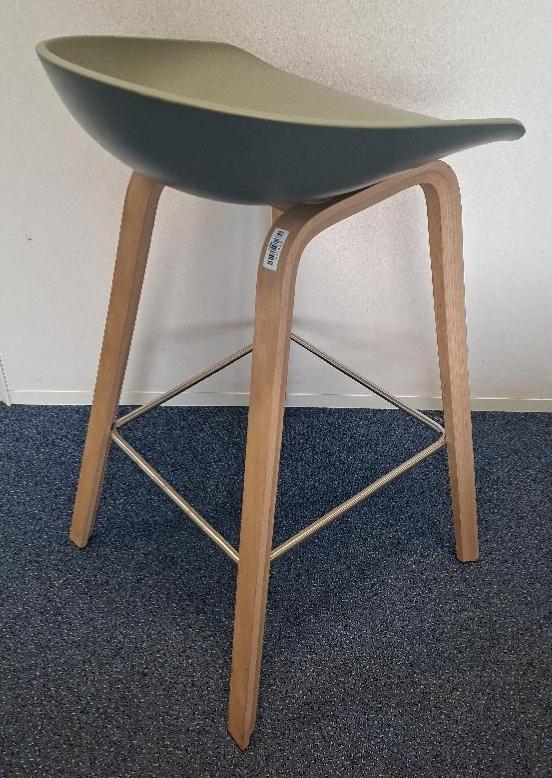 Tabouret design Hee Welling modèle About A Stool édition Hay, coque en polypropylène vert kaki, pieds en bois naturel avec repose pieds en métal. 74 x 43 x 44 cm. 3 unités. Vendu à l’unité avec faculté de réunion. Localisation: Tour Coeur Défense – 92400 Courbevoie (TA 26ème)