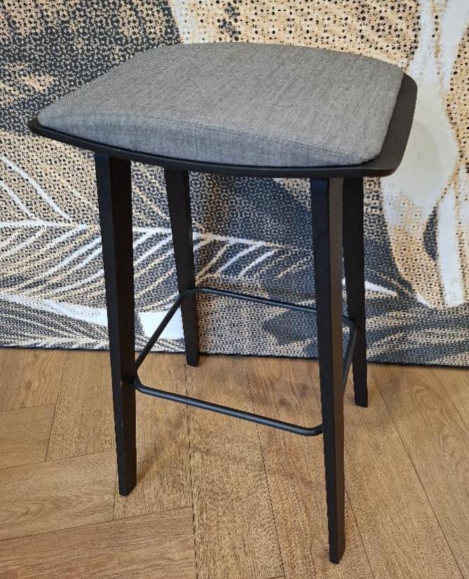 Tabouret haut de marque Four Design modèle Four Stool en bois laqué noir avec repose-pied en métal et galette d’assise en tissu gris. 78 x 44 x 31 cm. 10 unités. Vendu à l’unité avec faculté de réunion. Localisation: Tour Coeur Défense – 92400 Courbevoie (TA cafet)