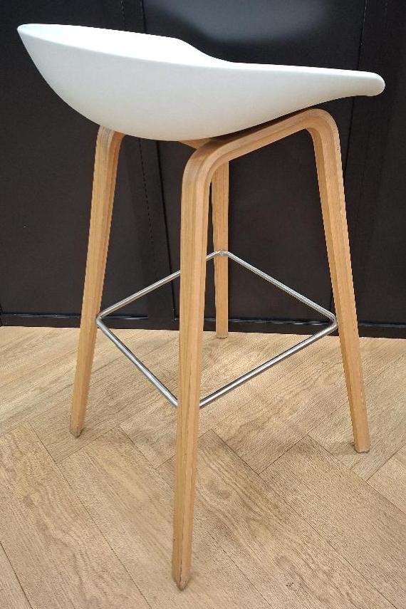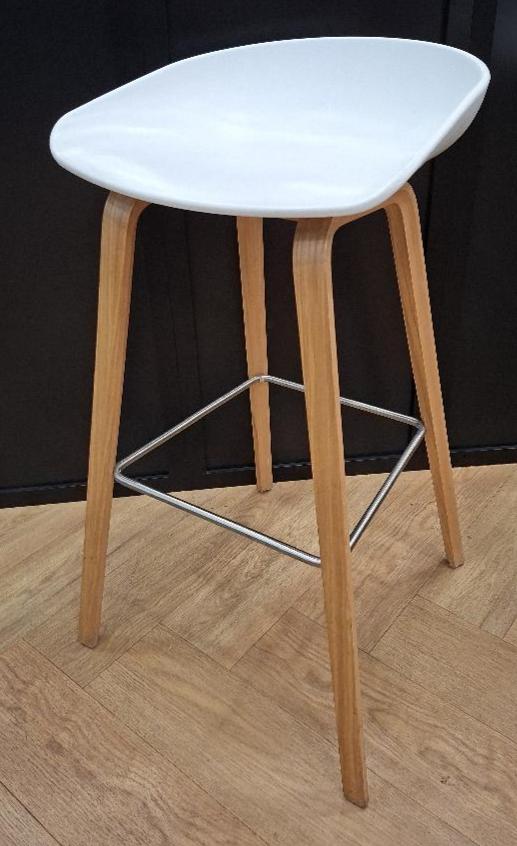 Tabouret haut design Hee Welling modèle About A Stool édition Hay, coque en polypropylène blanc, piétement en bois naturel avec repose pieds en métal. 84 x 44 x 47 cm. 19 unités. Vendu à l’unité avec faculté de réunion. Localisation: Tour Coeur Défense – 92400 Courbevoie (TA cafet)