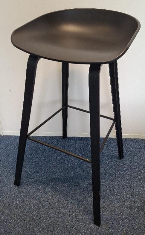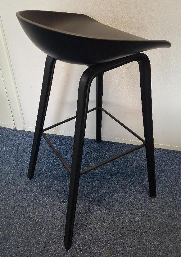 Tabouret haut design Hee Welling modèle About A Stool édition Hay, coque en polypropylène noir, pieds en bois laqué noir avec repose pieds en métal. (usures). 84 x 44 x 47 cm. 12 unités. Vendu à l’unité avec faculté de réunion. Localisation: Tour Coeur Défense – 92400 Courbevoie (TA 26ème: 7 unités / TB4 cafet: 5 unités)