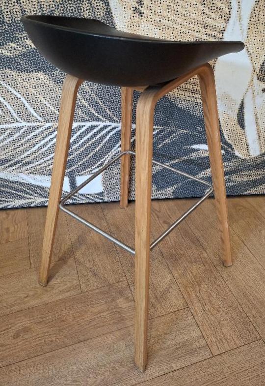 Tabouret haut design Hee Welling modèle About A Stool édition Hay, coque en polypropylène noir, piétement en bois naturel avec repose pieds en métal. 84 x 44 x 47 cm. 4 unités. Vendu à l’unité avec faculté de réunion. Localisation: Tour Coeur Défense – 92400 Courbevoie (TA cafet)