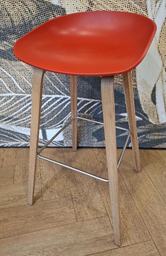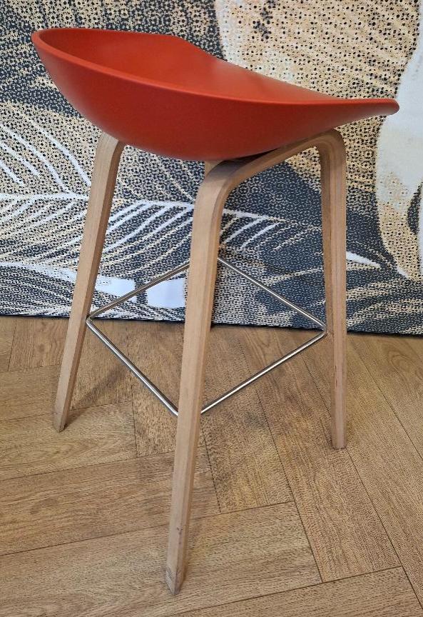 Tabouret haut design Hee Welling modèle About A Stool édition Hay, coque en polypropylène rouge orangé, piétement en bois naturel avec repose pieds en métal. 84 x 44 x 47 cm