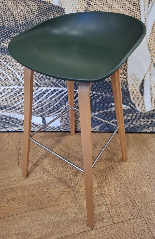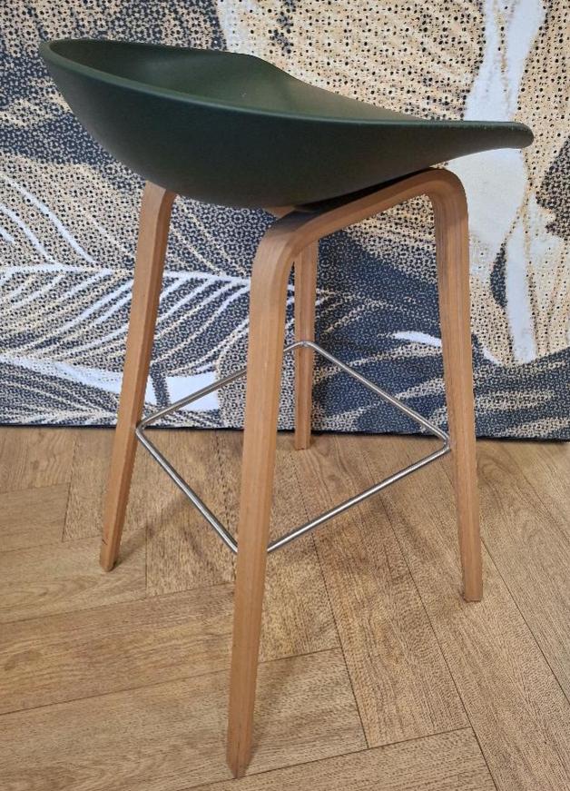 Tabouret haut design Hee Welling modèle About A Stool édition Hay, coque en polypropylène vert bouteille, piétement en bois naturel avec repose pieds en métal. 84 x 44 x 47. 8 unités. Vendu à l’unité avec faculté de réunion. Localisation: Tour Coeur Défense – 92400 Courbevoie (TA cafet)