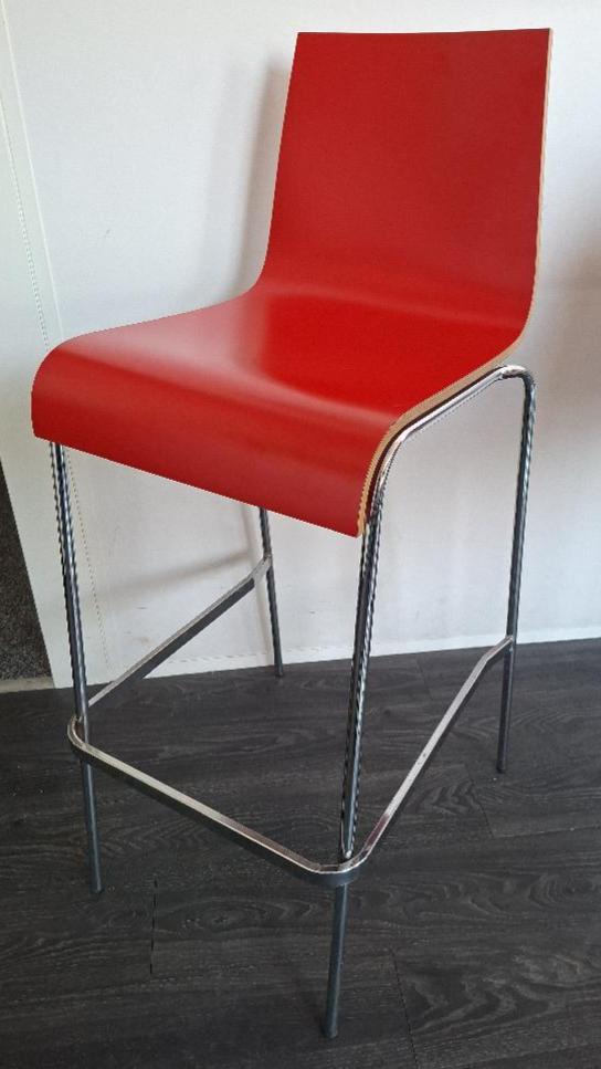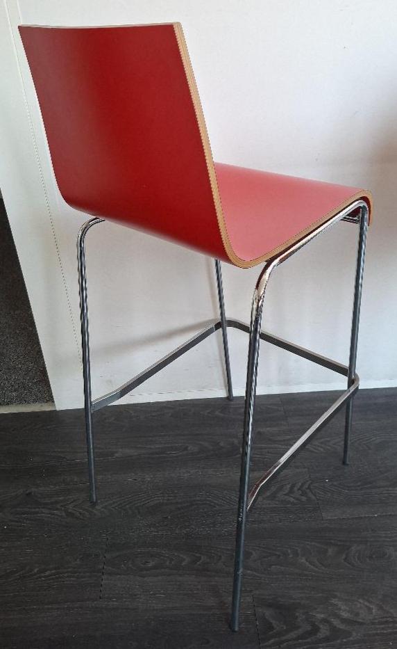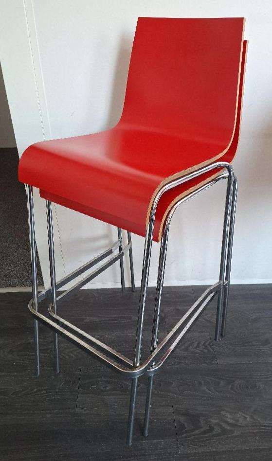 Tabouret haut empilable, coque en bois contreplaqué laqué rouge, piétement en acier tubulaire chromé. 106 x 43 x 54 cm. 8 unités. Vendu à l’unité avec faculté de réunion. Localisation: 30 rue Beauregard – 60440 Nanteuil-Le-Haudouin