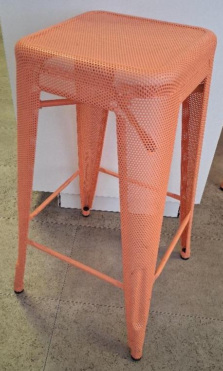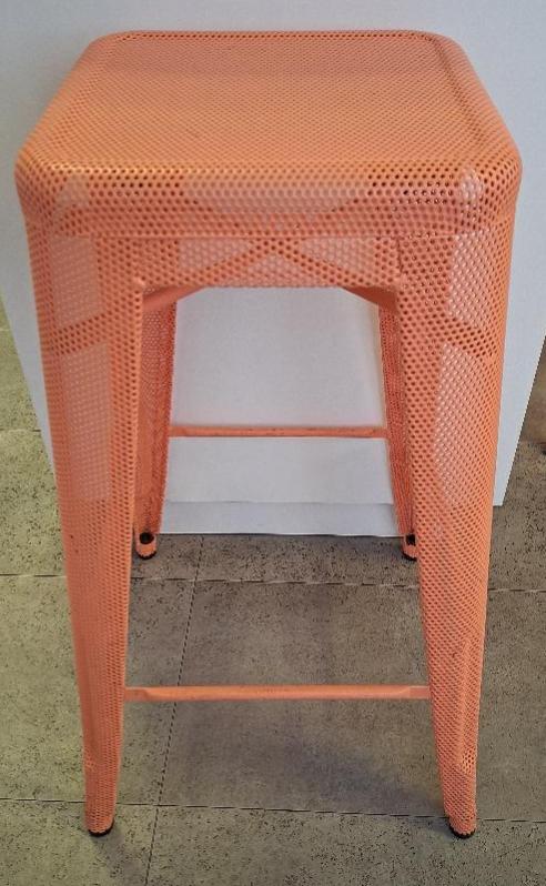 Tabouret haut empilable en tôle perforée couleur saumon. 71 x 41 x 41 cm. 14 unités. Vendu à l’unité avec faculté de réunion. Localisation: 26 rue Cambaceres – 75008 Paris. (1er cafet)
