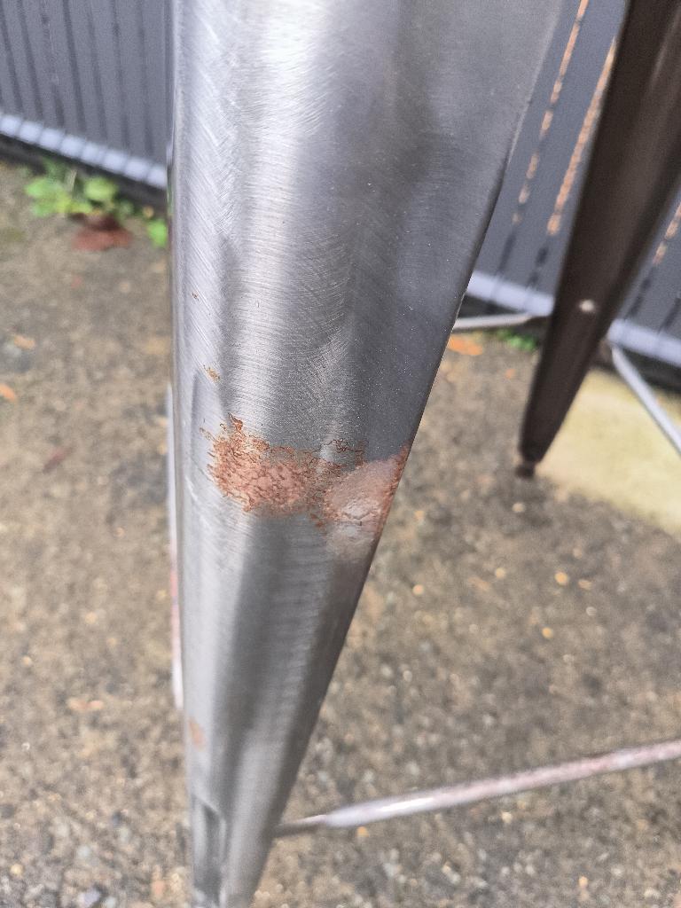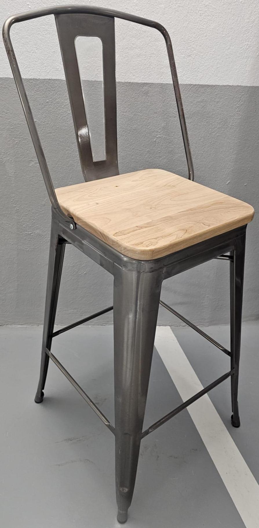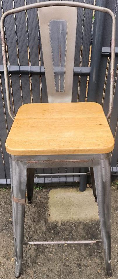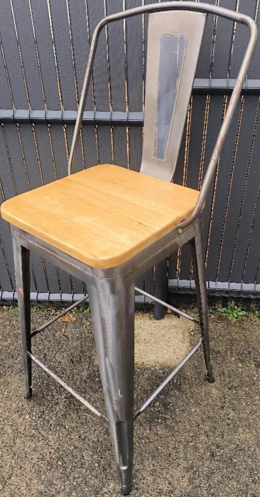 Tabouret haut industriel de marque Aubry Gaspard, piétement avec repose pieds et dossier en métal de couleur acier brossé, assise en bois d’orme huilé. 120 x 48 x 45 cm. (usures). 2 unités; Vendu à l’unité avec faculté de réunion. Localisation : 30 rue Beauregard 60440 Nanteuil-le-Haudouin.