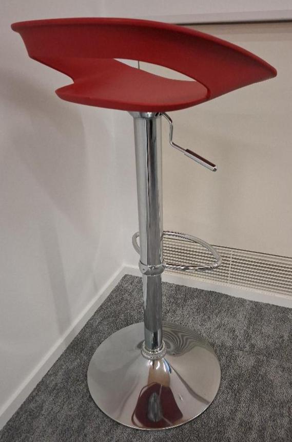 Tabouret haut pivotant ajustable, coque ajourée en plastique rouge reposant sur un pied central en acier chromé. 79 x 40 x 42 cm. 4 unités. Vendu à l’unité avec faculté de réunion. Localisation: 38 rue de Lamirault – 77090 Collégien