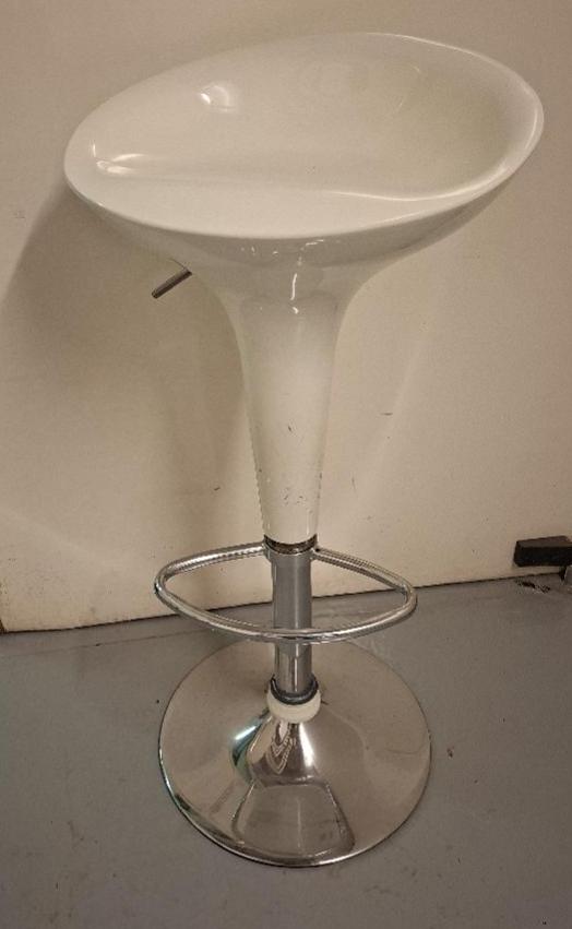 Tabouret haut pivotant ajustable, coque en plastique blanc, piétement en acier chromé. 88 x 44 x 40 cm. 3 unités. Localisation: -1 réserve