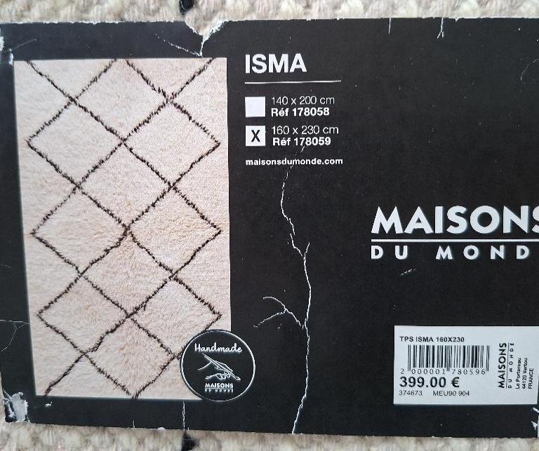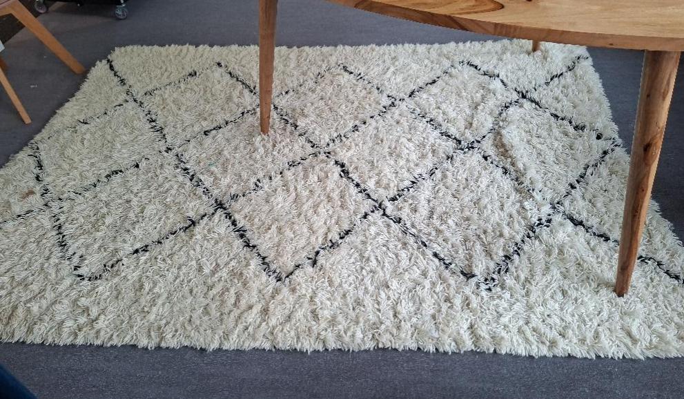 Tapis de marque Maisons du Monde modèle Isma à fond beige et motifs géométriques noirs. (tâches). 160 x 230 cm. (3ème). Localisation: 10 rue d’Arcueil – 94150 Rungis