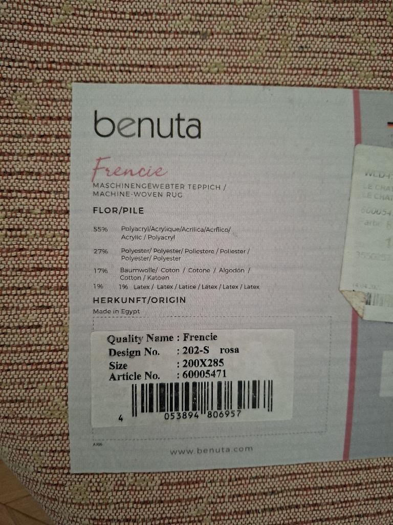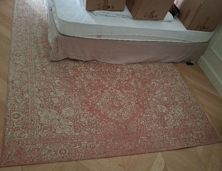 Tapis mécanique de marque Benuta dans les tons roses et beiges. 200 x 285 cm. 2 unités. Vendu à l’unité avec faculté de réunion. Localisation: BLB, 3 rue de la Fossé aux Leux – 91700 Sainte Geneviève des Bois