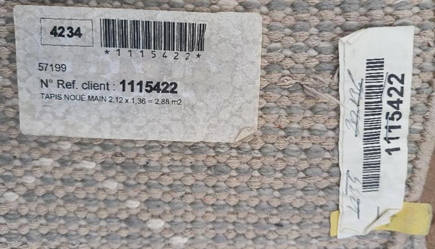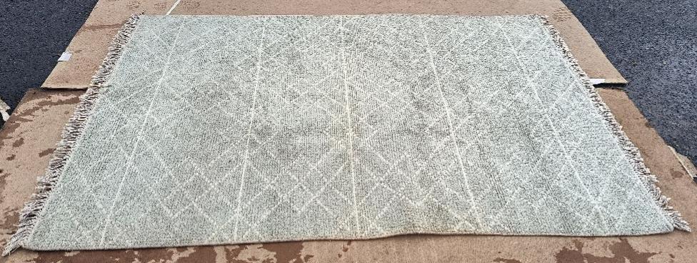 Tapis noué à la main à fond beige et gris, motifs géométriques blancs. (tâches). Dim : 136 x 212 cm. Localisation : 30 rue Beauregard 60440 Nanteuil-le-Haudouin